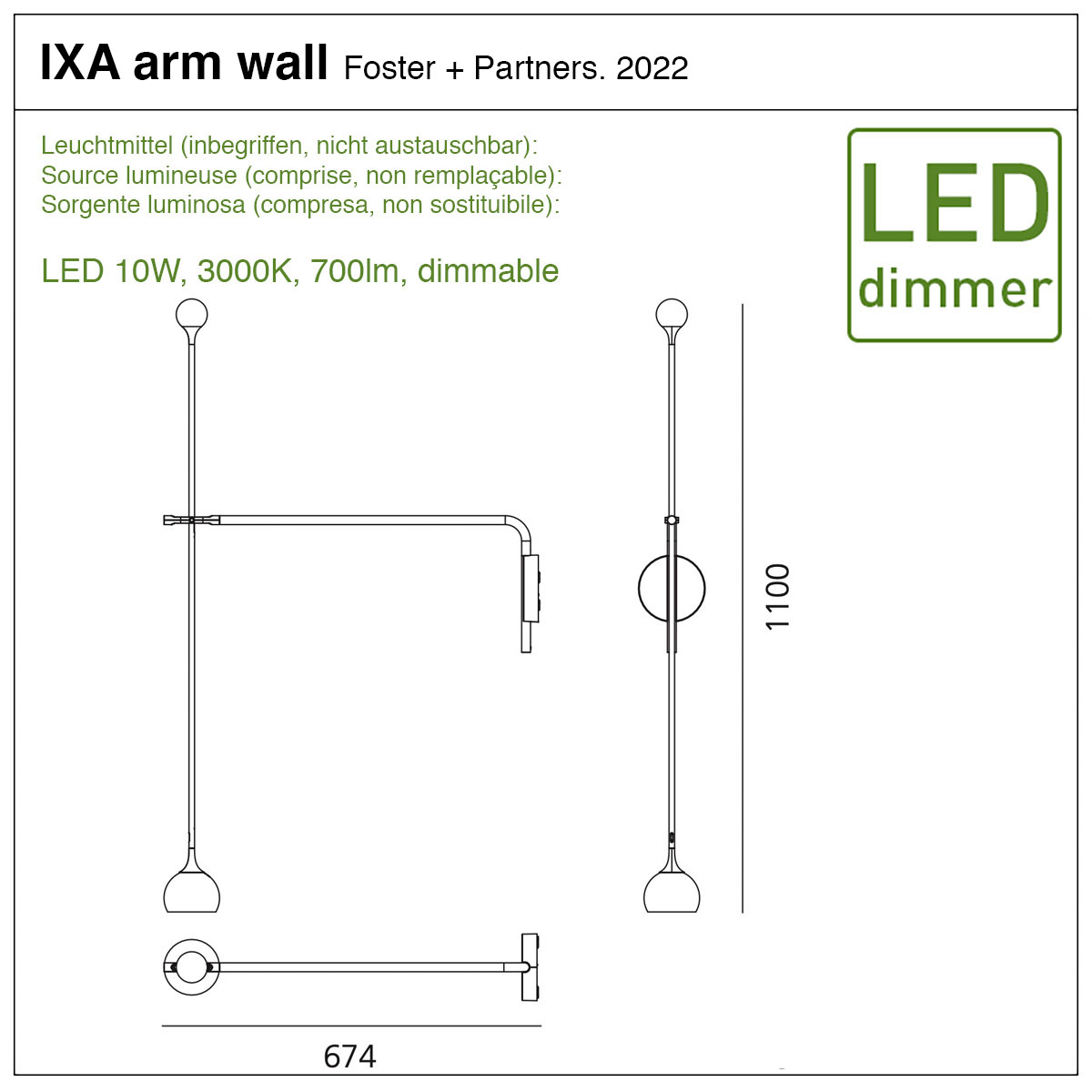 • Source lumineuxe : LED 10W, 3000K, 700lm, (incluse, non remplaçable), dimmable