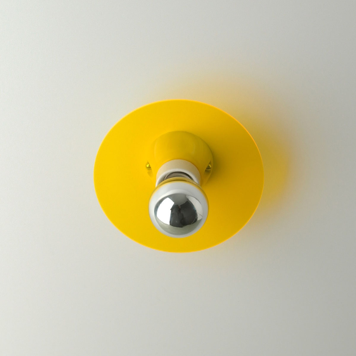 La base en céramique porte un disque en verre acrylique blanc opale qui reflète la lumière de l’ampoule dans l’espace et qui crée de beaux jeux d’ombre et de lumière à l’arrière.