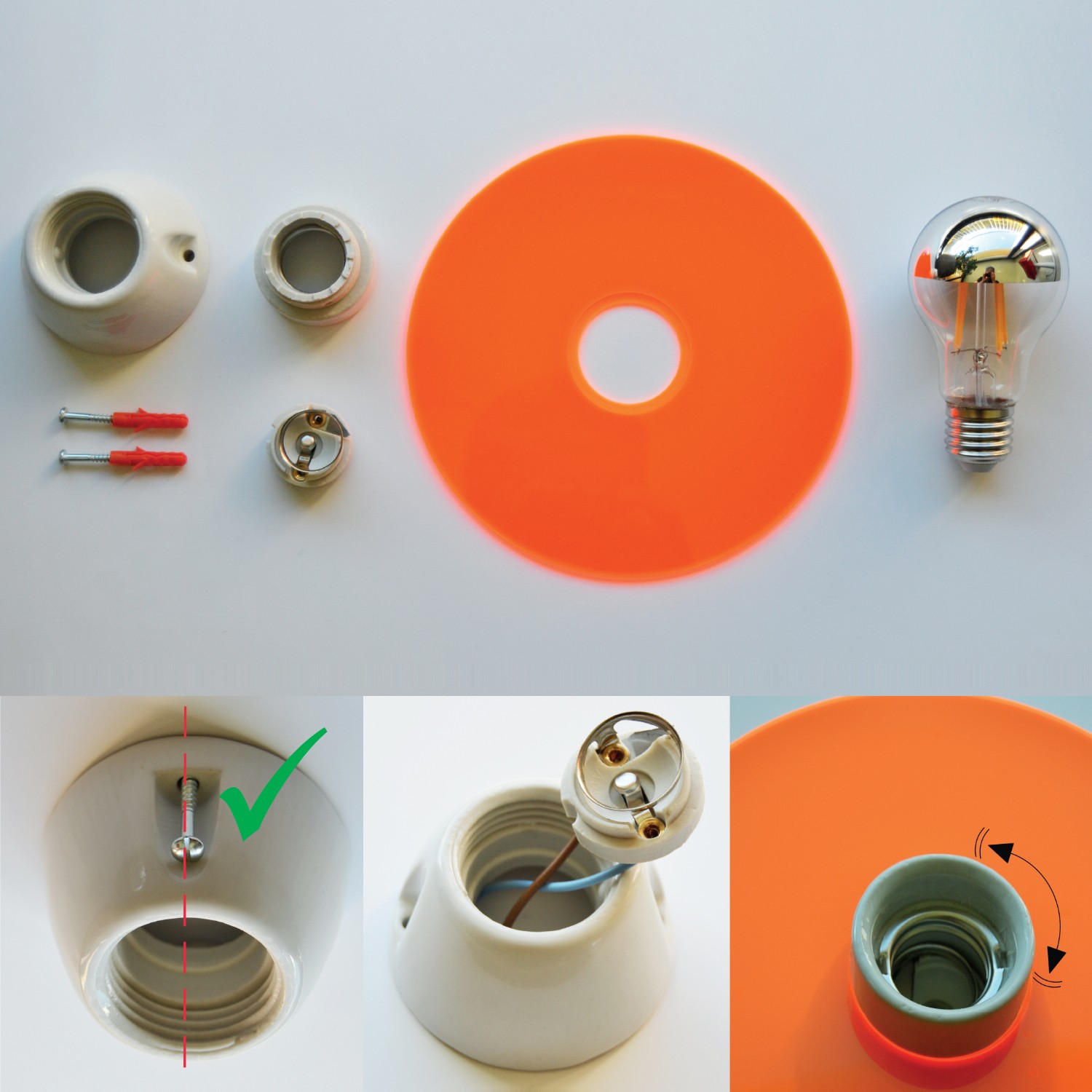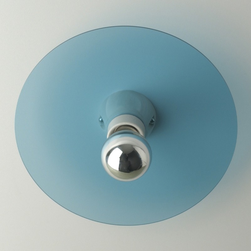 La base en céramique porte un disque en verre acrylique blanc opale qui reflète la lumière de l’ampoule dans l’espace et qui crée de beaux jeux d’ombre et de lumière à l’arrière.