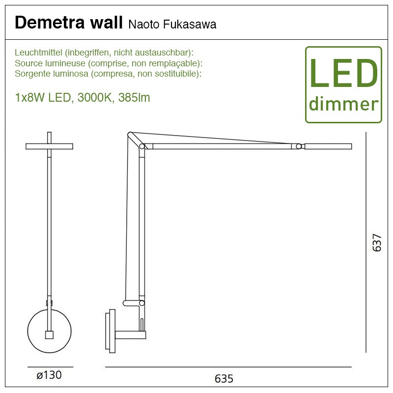 Demetra est une lampe avec tête et bras orientables. Le réflecteur est équipé d’un variateur sensitif qui permet de régler l’intensité de lumière selon les besoins.