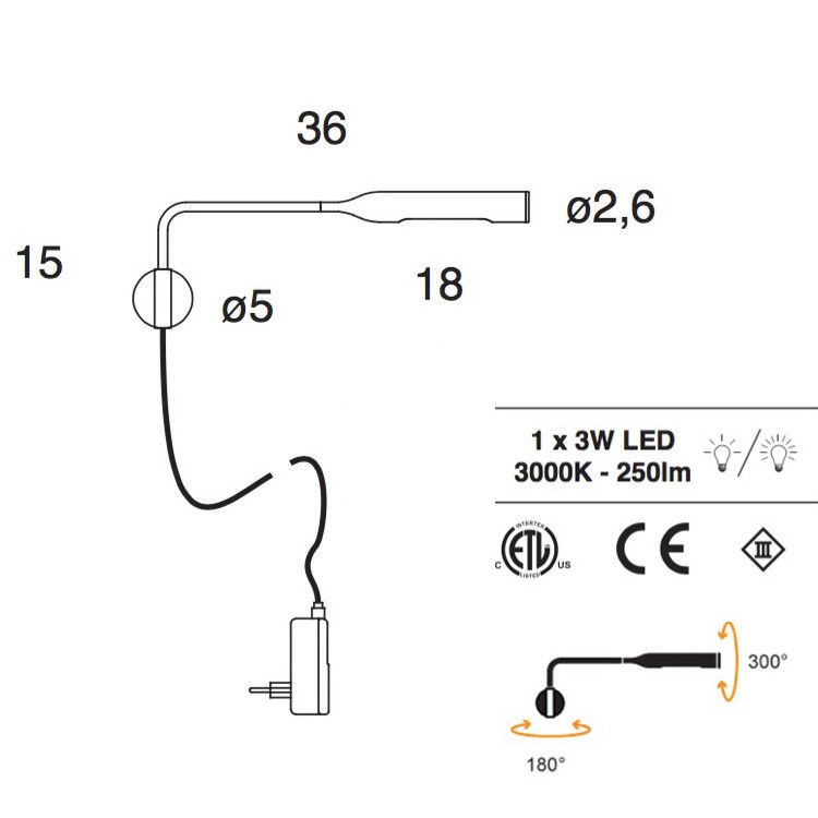 Tête pivotante à 300° permettant de diriger la lumière, le bras pivote sur la fixation murale à 180°.