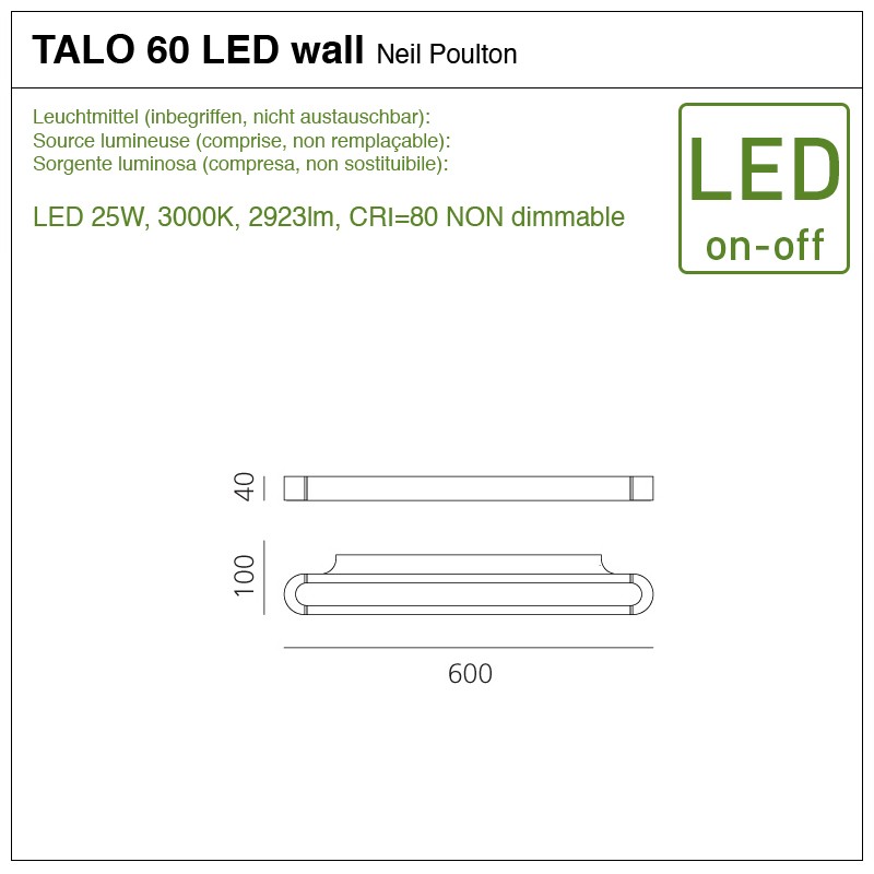 • Source lumineuse : LED 25W, 3000K, 2923lm, CRI=80 NON dimmable (comprise)