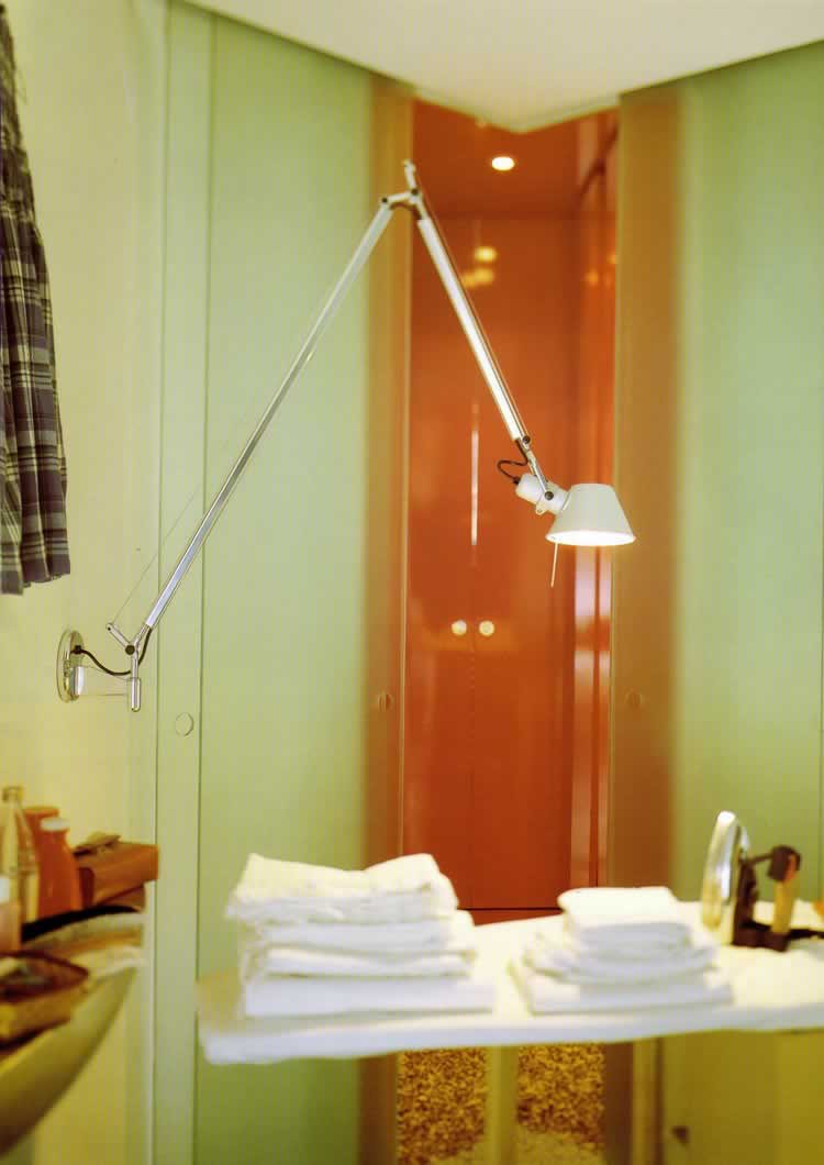Structure à bras articulé en aluminium poli, diffuseur, orientable dans toutes les directions, en aluminium anodisé opaque, rotules et supports en aluminium brillant. Système d’équilibrage à ressorts. Support applique en aluminium brillant. Emission lumineuse directe orientable.