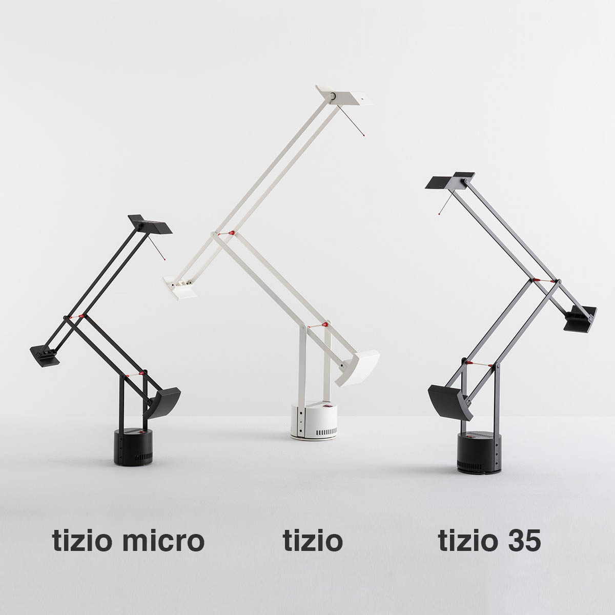 Le bras de la lampe de table Tizio est maintenu dans n’importe quelle position par un contrepoids. Les bras réglables, la tête de lampe et le contrepoids sont en aluminium verni. Répartition directe et réglable de la lumière en deux intensités lumineuses.