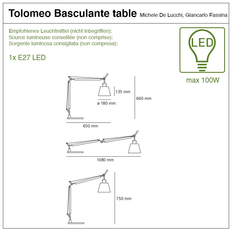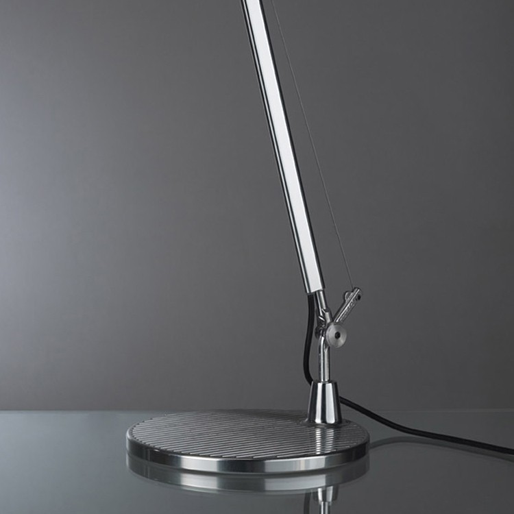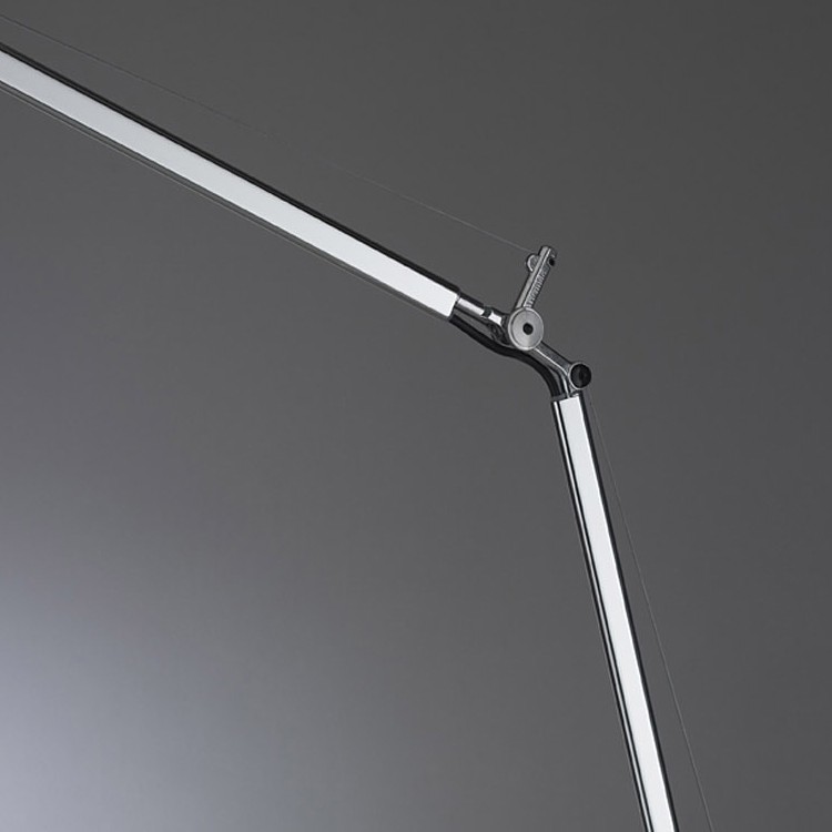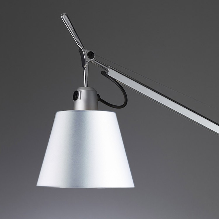 Tolomeo basculante satin a des bras articules avec système d’équilibrage à ressorts. Le diffuseur en satin de soie, dans le cadre d’une utilisation normale, se place verticalement, indépendamment de la position du bras.