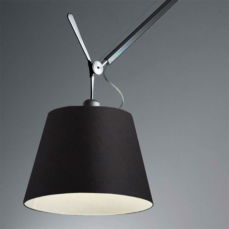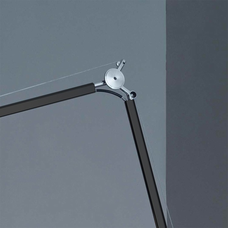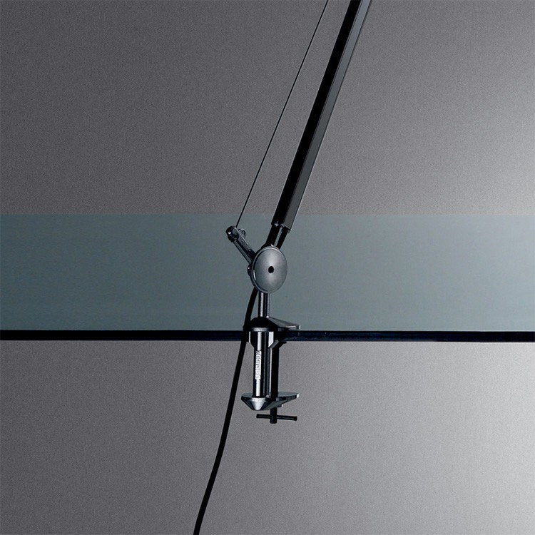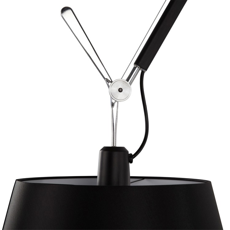 Structure à bras articulés en aluminium anodisé poli, rotules et supports en aluminium brillant. Diffuseur noir orientable sur l’axe horizontal. Système d’équilibrage à ressorts. Emission de lumière directe et diffuse, orientable.