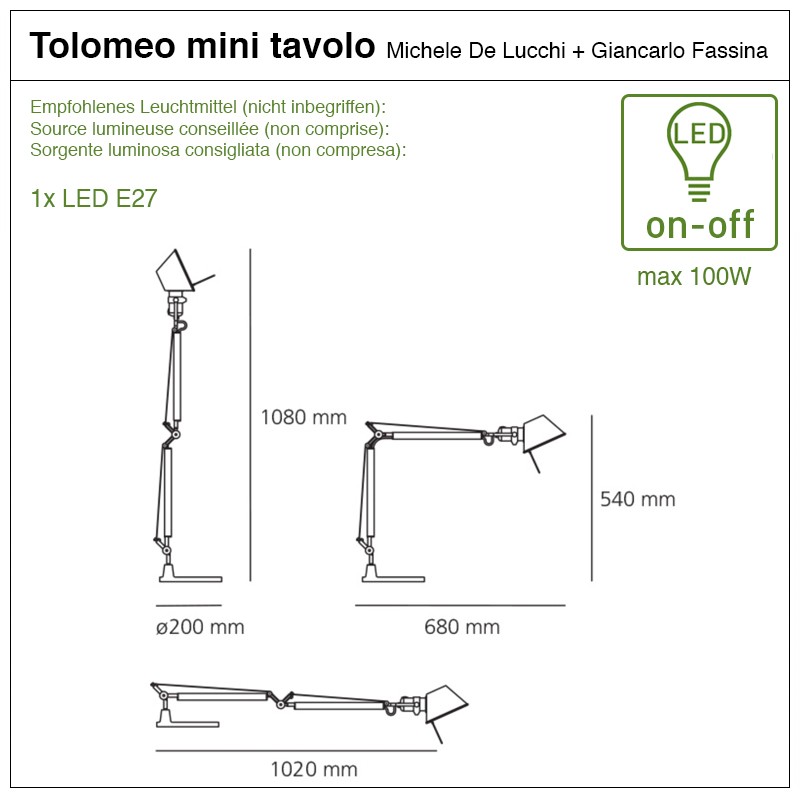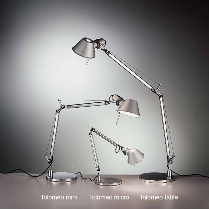 La lampe de table Tolomeo mini, lancée en 1987, est un classique du design de la marque Artemide. La série de luminaires Tolomeo avec le système d’équilibrage à ressorts a des bras réglables et est très flexible dans l’utilisation.