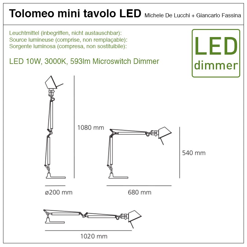 La lampe de table Tolomeo mini, lancée en 1987, est un classique du design de la marque Artemide. La série de luminaires Tolomeo avec le système d’équilibrage à ressorts a des bras réglables et est très flexible dans l’utilisation.