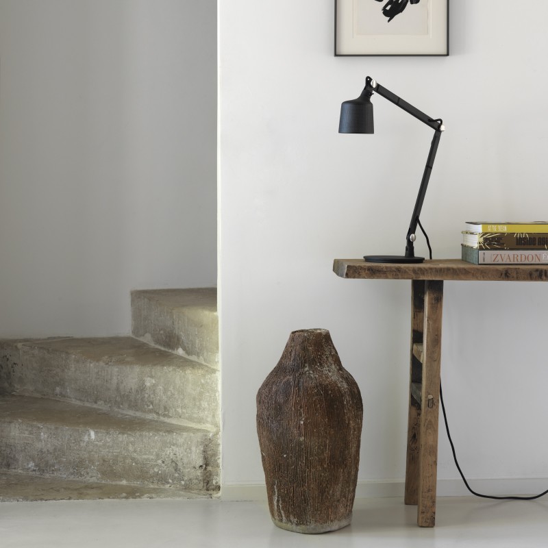 La lampe de table Vipp 521 est équipée d’un bras orientables pour cibler l’éclairage, de vis de serrage ergonomiques pour verrouiller la position de la lampe et d’un pied massif pour la stabilité.