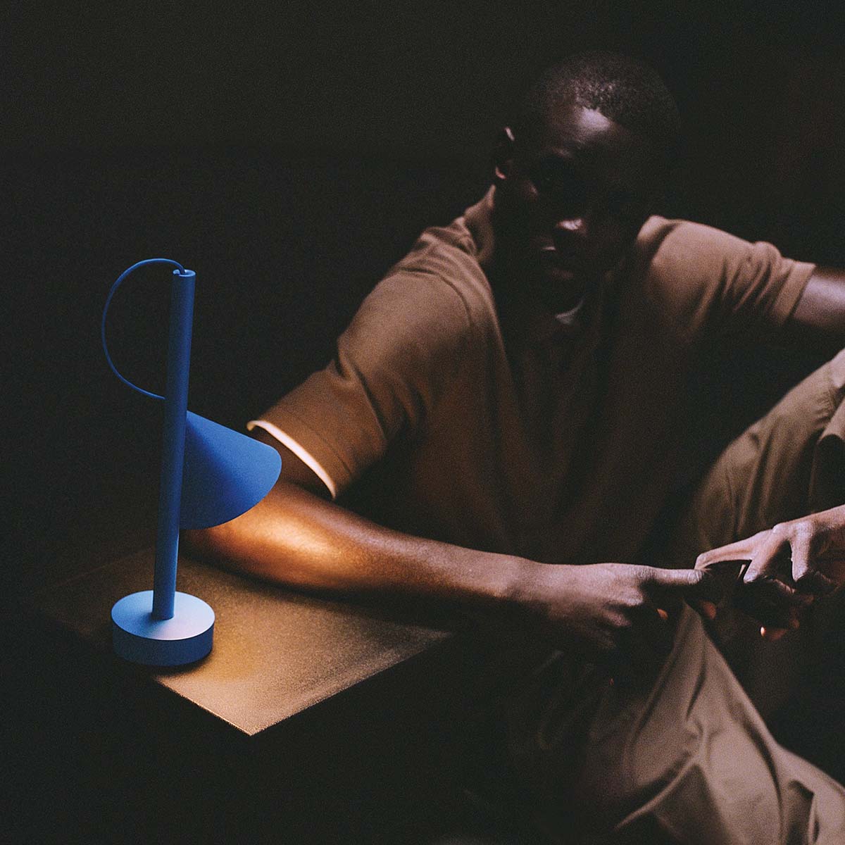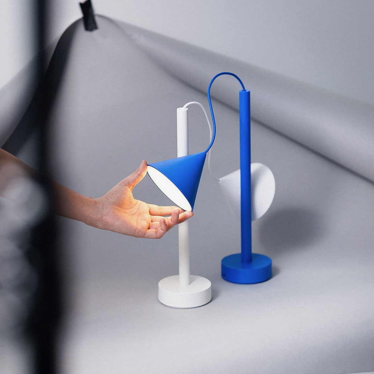 Les éléments magnétiques permettent d’orienter la lumière et d’agencer les trois composants de la lampe selon les envies : comme lampe de table, en version portable avec le pied séparé, ou en mode suspension avec le câble textile.