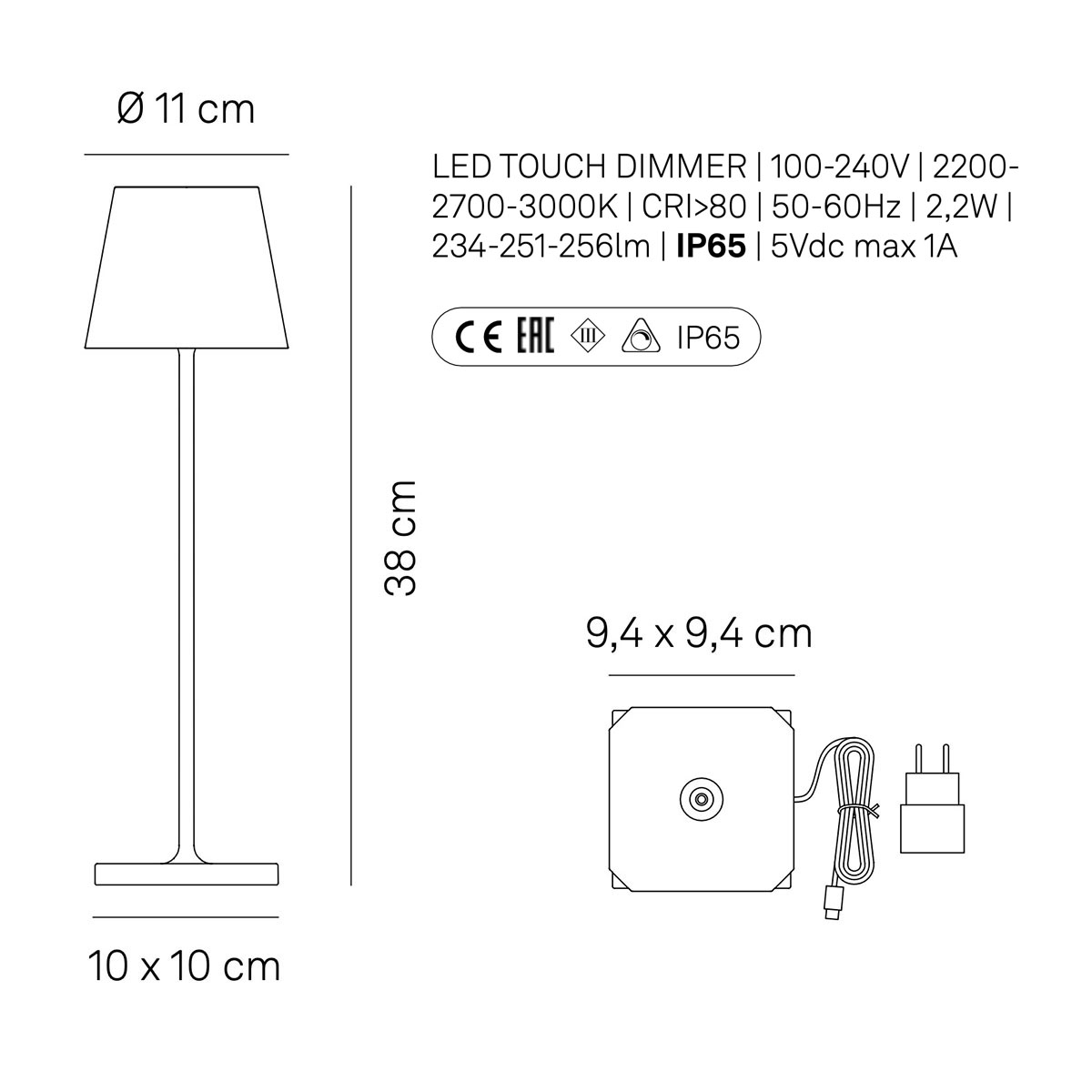 • Source lumineuse : LED 2,2 W Touch Dimmer | 2200-2700-3000K | 234-251-256 lm | IP65 | 5Vdc max 1A