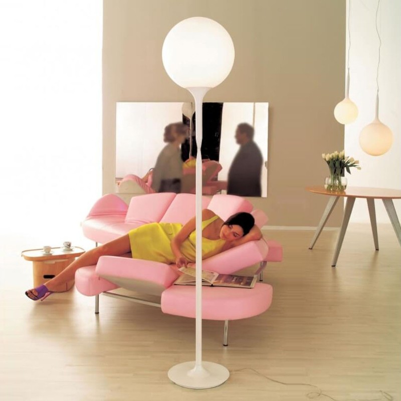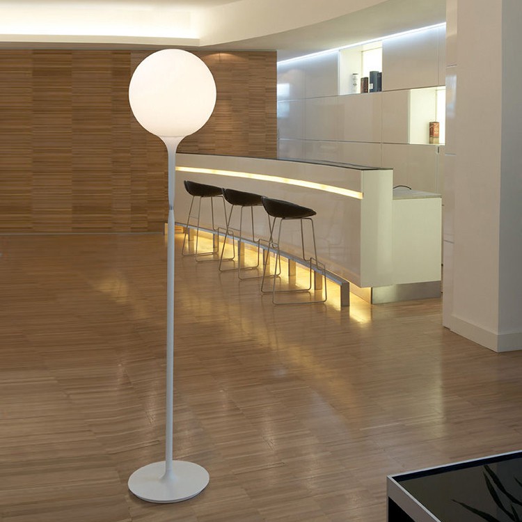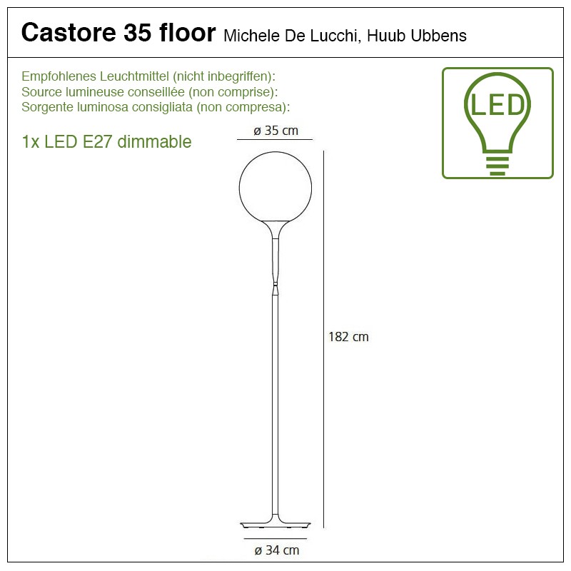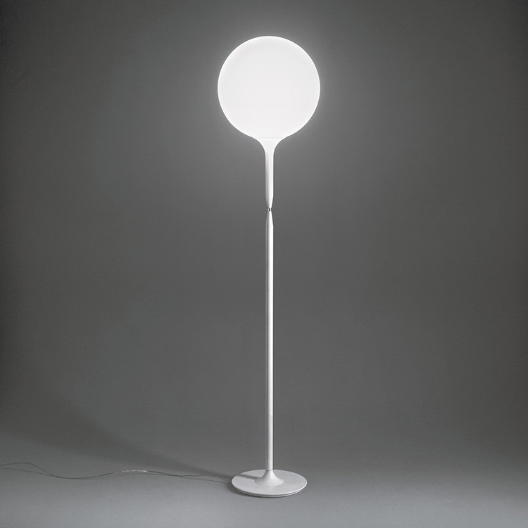 La lampe sur pied Castore 35 terra de Artemide a un diffuseur sphérique qui se termine par une tige lumineuse de forme effilée constituant un doux passage de la lumière intense du diffuseur à la zone d’ombre de la structure de la lampe.