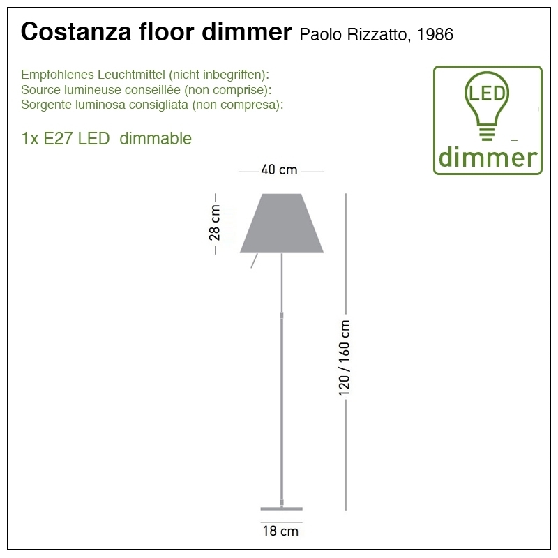 • Dimensions : pied 18x18cm, hauteur 120-160cm, diamètre diffuseur 40cm.