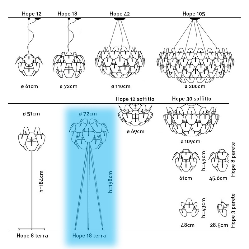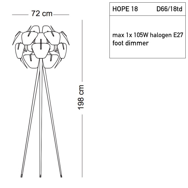• Dimensions: hauteur 198cm, diamètre diffuseur 72cm, diamètre au sol 40cm.