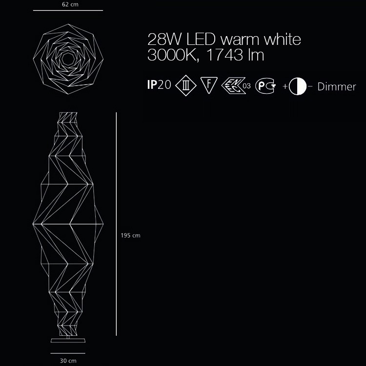 Source lumineuse : 28W LED warm white 3000K, 1743 lm – avec régulateur d’intensité lumineuse.