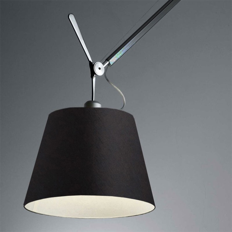 Structure à bras articulé en aluminium poli, diffuseur en satin de soie noire orientable sur l’axe horizontal. articulations et supports en aluminium brillanté. Système d’équilibrage à ressorts. Base en aluminium poli.