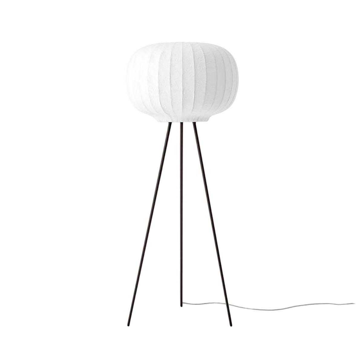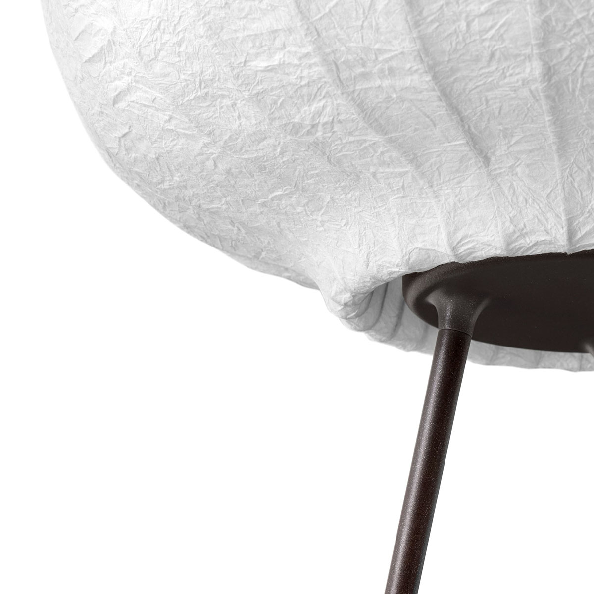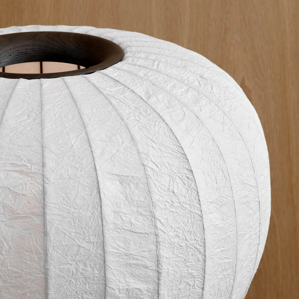 L’abat-jour repose sur un pied tripode en aluminium thermolaqué brun foncé. Le papier est relié à un anneau supérieur en chêne foncé et diffuse une lumière chaleureuse. Des méthodes ancestrales de fabrication du papier ont été utilisées pour la création de chaque feuille de papier utilisée pour la lampe Vipp Paper. Issu de la tradition japonaise, ce procédé artisanal ajoute une dimension poétique, chaque abat-jour possédant sa propre histoire et sa texture distinctive.