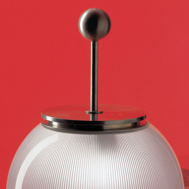 La première lampe d’Artemide. Structure en métal nickelé mat, diffuseur en verre, base en marbre noir. Les parties métalliques sont tournées à la main. Emission lumineuse directe et diffuse.