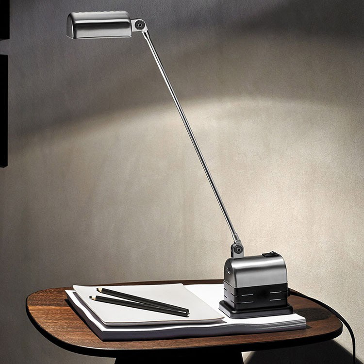 Lampe de table en métal avec bras articulé et orientable, diffuseur pivotant sur 360 degrés, base en matière synthétique noire.