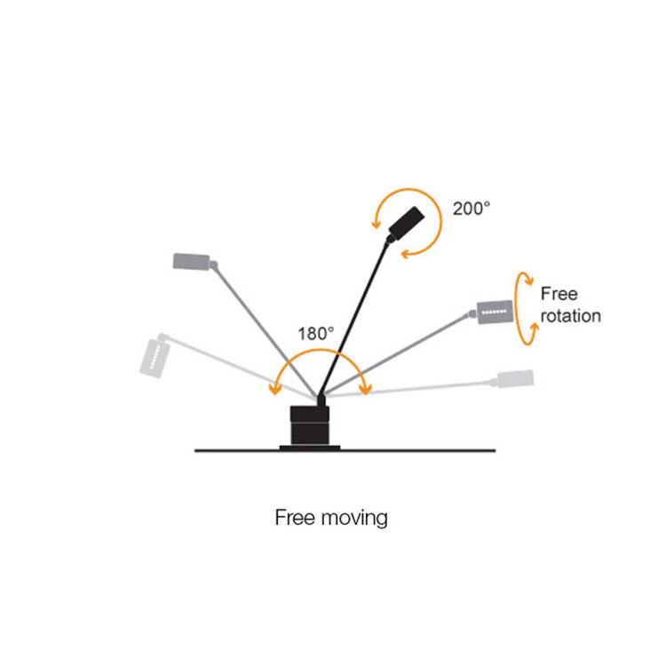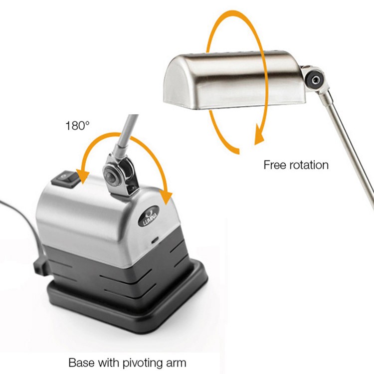Lampe de table en métal avec bras articulé et orientable, diffuseur pivotant sur 360 degrés, base en matière synthétique noire.