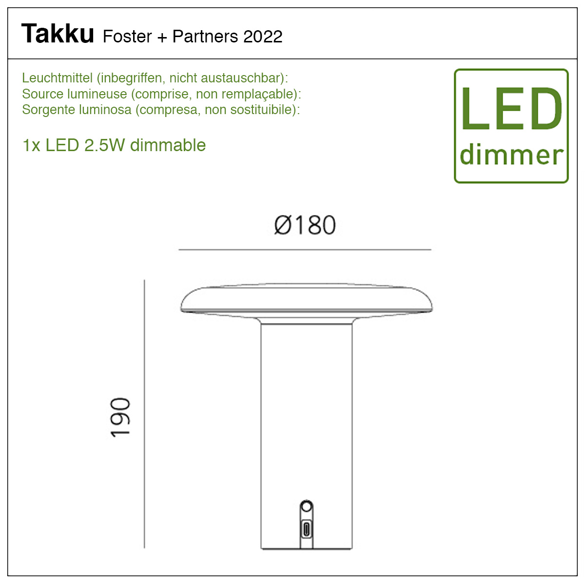 32 heures d’autonomie font de la lampe de table Takku la solution idéale pour l’interprétation flexible de la lumière personnelle dans les lieux privés et publics.