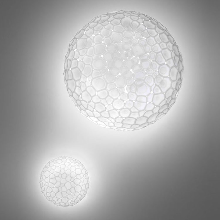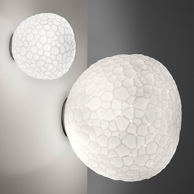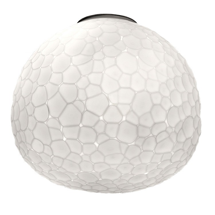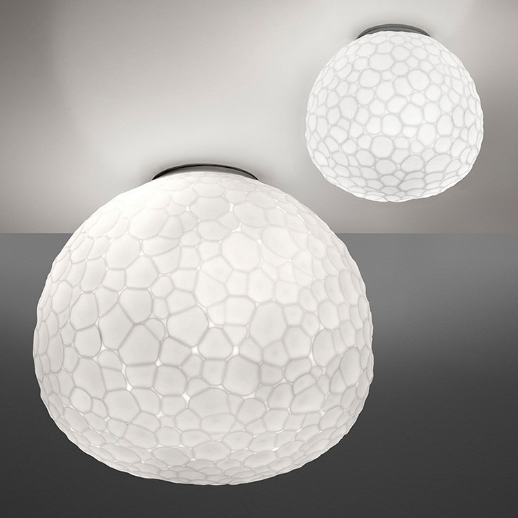 Le diffuseur de la famille de luminaires Meteorite de Artemide est réalisé en verre artistique avec une double couche, obtenu avec la technique artisanale du soufflage dans un moule fermé et traité avec un abrasif.