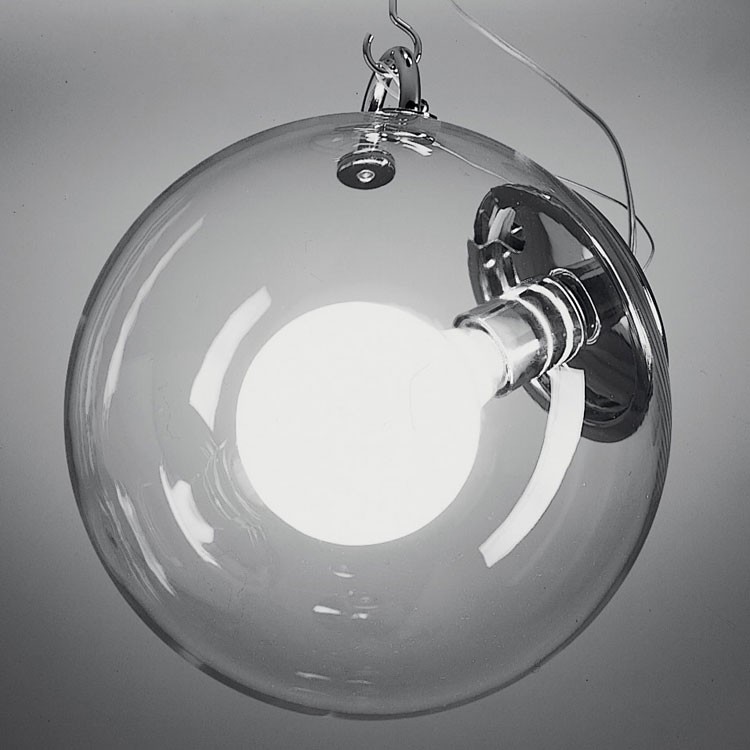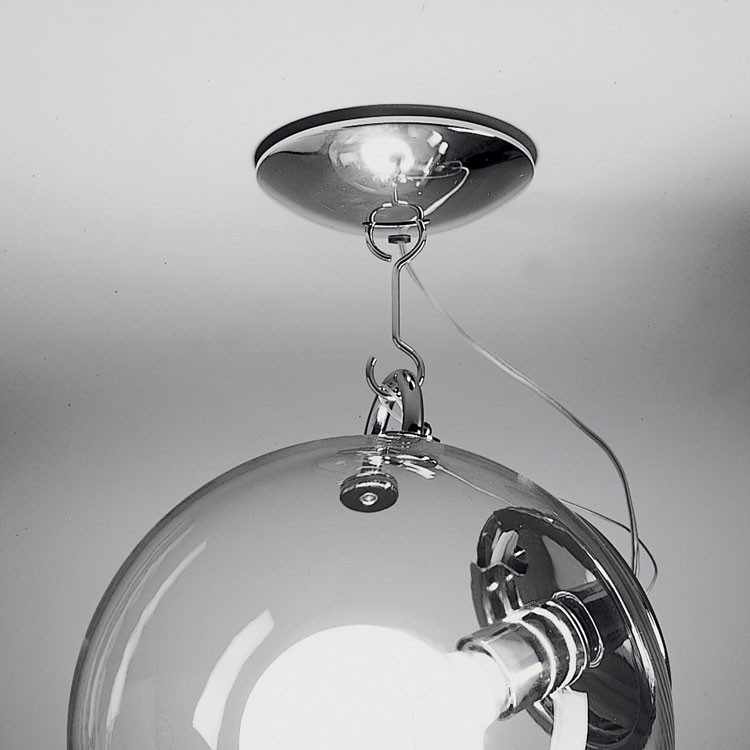 Miconos soffitto plafonnier de Artemide.Structure en métal chromé brillant. Diffuseur en verre soufflé transparent. Emission lumineuse diffuse.