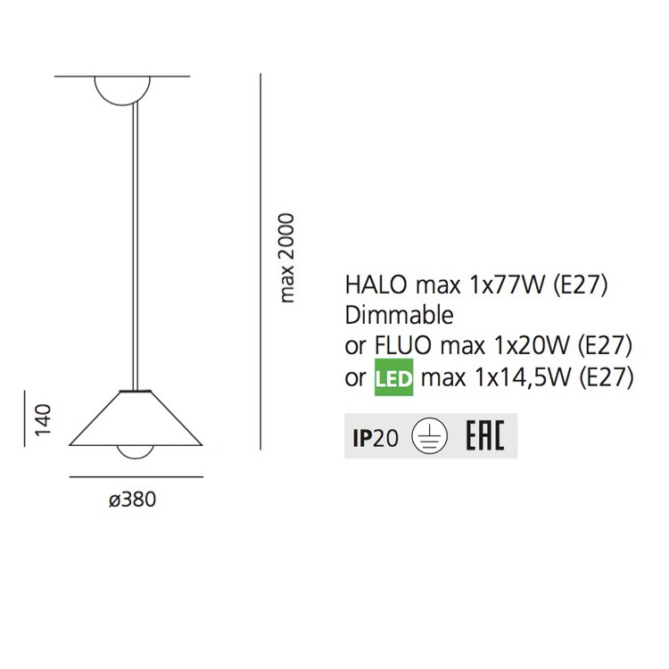 Source lumineuse : HALO max 1x77W (E27) dimmable ou FLUO max 1x20W (E27) ou LED max 1×14,5W (E27)