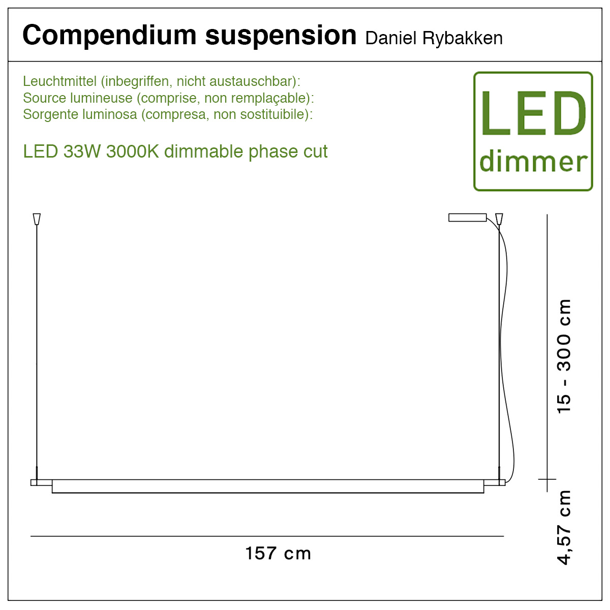 • Source lumineuse : LED 33W 3000K (comprise, non échangeable) dimmable depuis un interrupteur mural (dimmable phase cut)