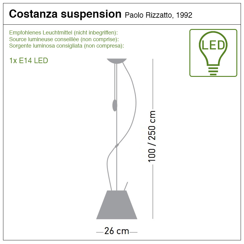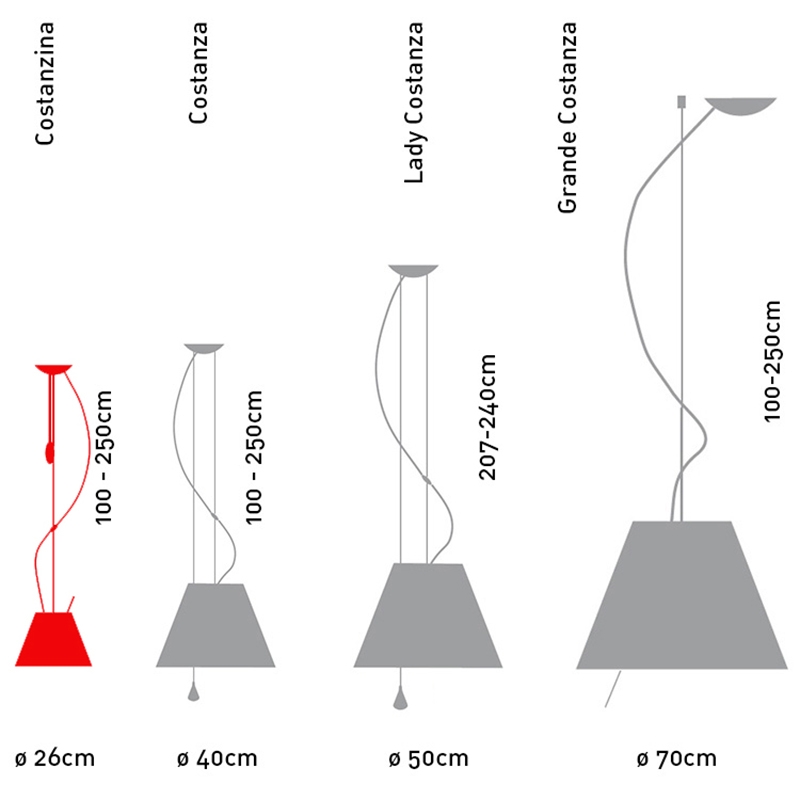 La série de luminaires dessinée par Paolo Rizzatto est élégante et intemporelle, elle s’insère très naturellement dans tous les environnements. Costanzina est l’archétype de l’élégance moderne. Le diffuseur en polycarbonate est soutenu sur deux seuls points d’appui.