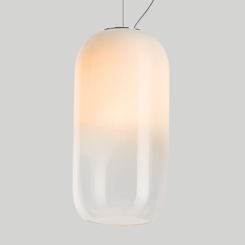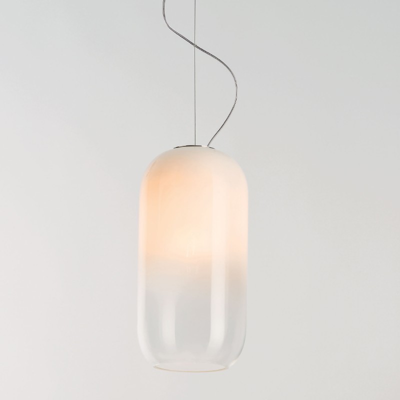 La forme organique de la lampe Gople met en valeur la beauté du verre, travaillé à la main selon une ancienne technique vénitienne. Le verre blanc se transforme progressivement en verre de cristal, rendant chaque pièce unique.