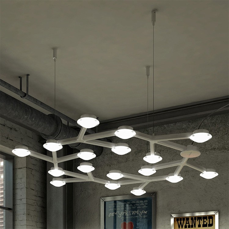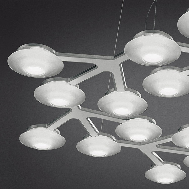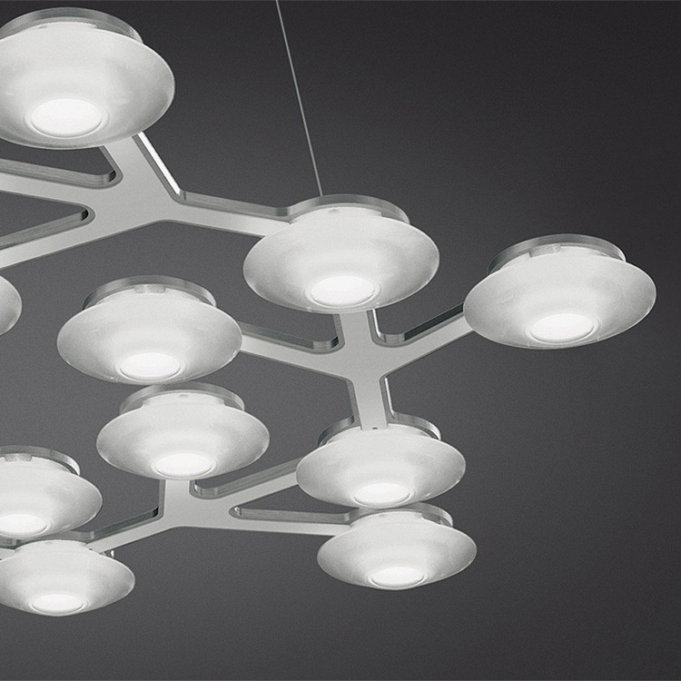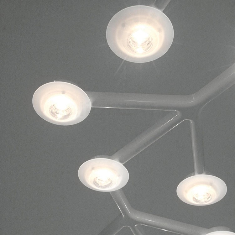 Les luminaires de la famille Led Net ont été conçus par les designers Michele de Lucchi et Alberto Nason pour Artemide. La structure de la lampe est composée d’éléments à forme de branche en aluminium verni blanc. Les lentilles LED sont en méthacrylate transparent, les supports des lentilles en méthacrylate satiné.