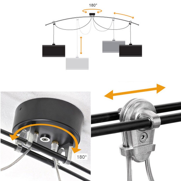 Les abat-jours peuvent glisser le long des rails jusqu’à la position désirée. La lampe peut tourner de 180 degrés.