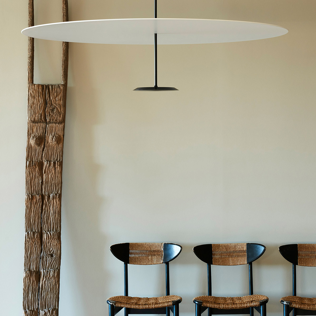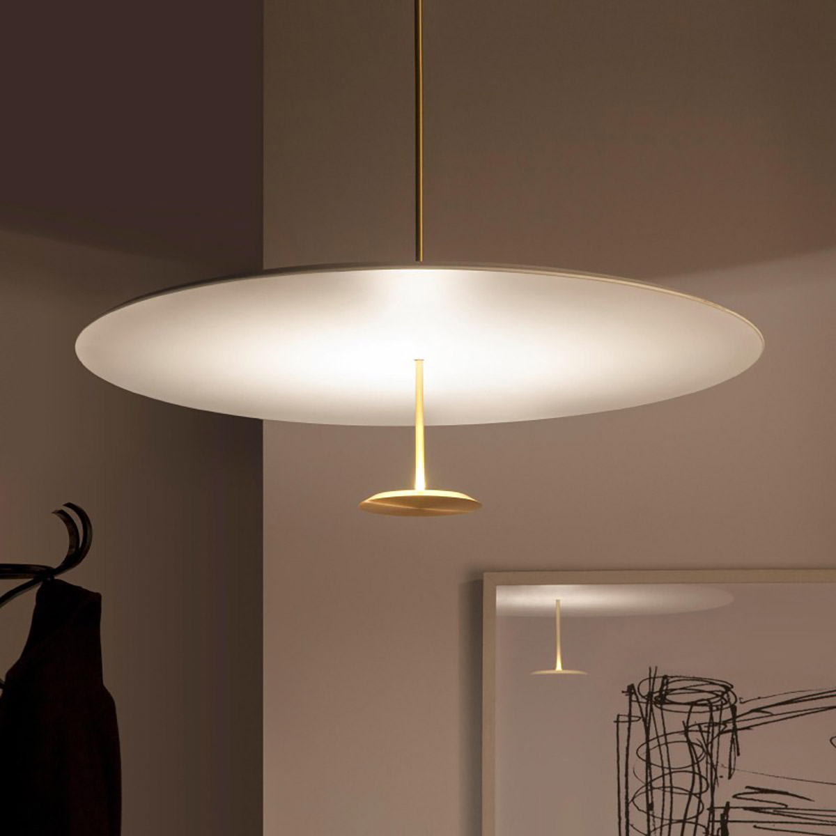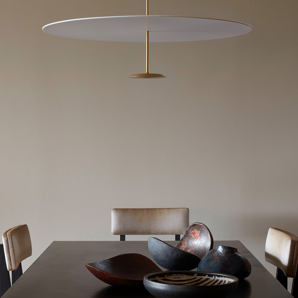 DOT est une suspension minimaliste qui donne l’apparence d’un disque de lumière flottant. Le petit disque inférieur est équipé d’un anneau LED qui dirige la lumière vers le grand disque blanc qui agit alors comme réflecteur.