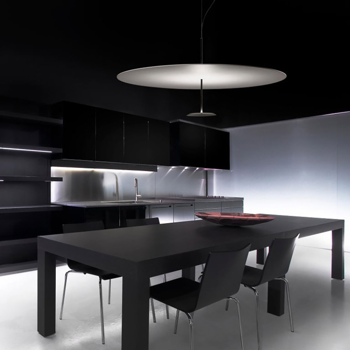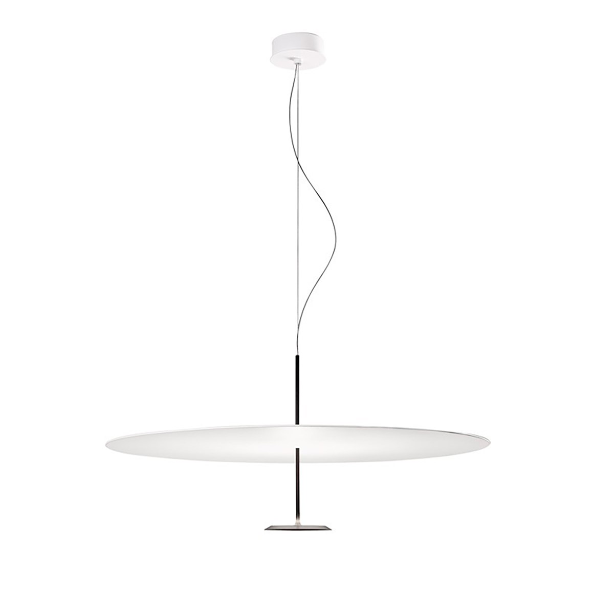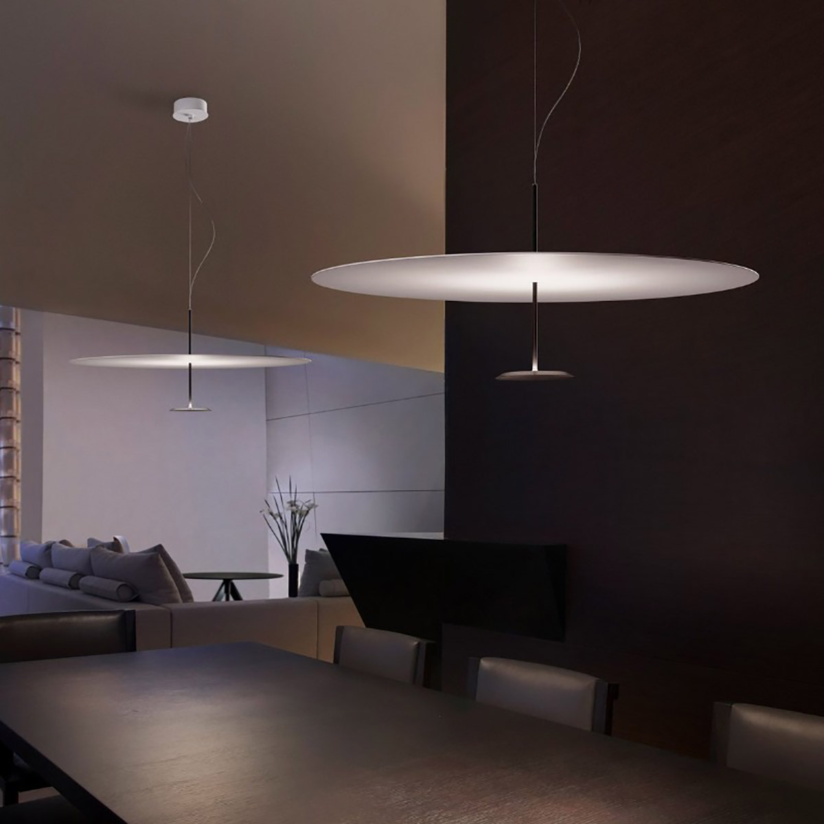 DOT est une suspension minimaliste qui donne l’apparence d’un disque de lumière flottant. Le petit disque inférieur est équipé d’un anneau LED qui dirige la lumière vers le grand disque blanc qui agit alors comme réflecteur.