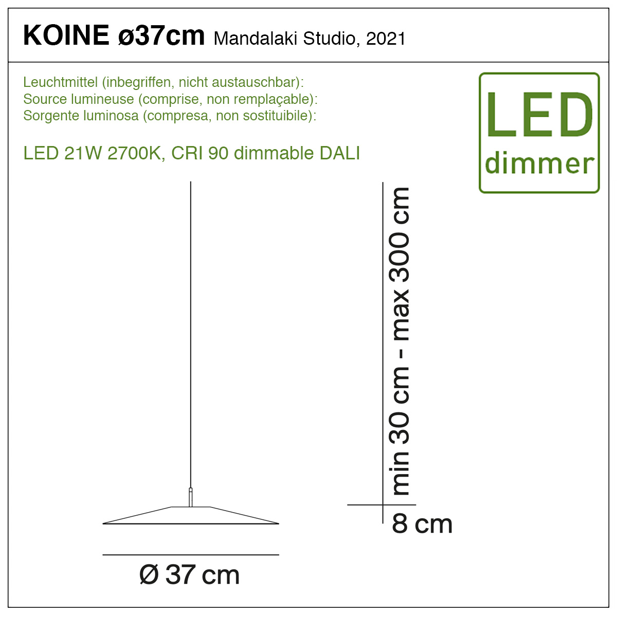 L’élégance et la pureté des formes caractérisent la suspension KOINE, extrêmement polyvalente. La source lumineuse a une lentille minérale spécialement développée. Le faisceau lumineux distribué par la lentille est homogène et clair, un large cône de lumière aux bords clairement définis.