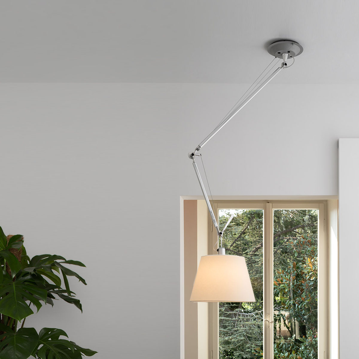 La suspension Tolomeo decentrata a une structure en aluminium avec des bras polis, elle est réglable individuellement et de manière flexible. Elle est idéale comme lampe attrayante au-dessus de la table à manger ou au-dessus de la table basse dans le salon ou sur le lieu de travail.