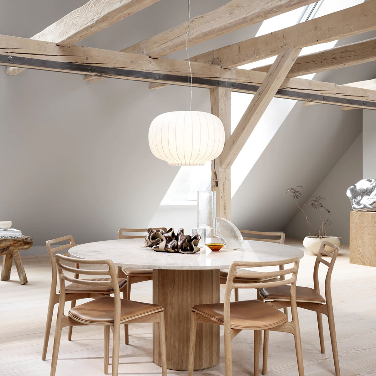 Inspirée des traditions japonaises des lanternes en papier, la suspension Vipp Paper fusionne l’artisanat du design asiatique avec un éclairage tamisé et chaleureux reconnu dans la décoration scandinave.