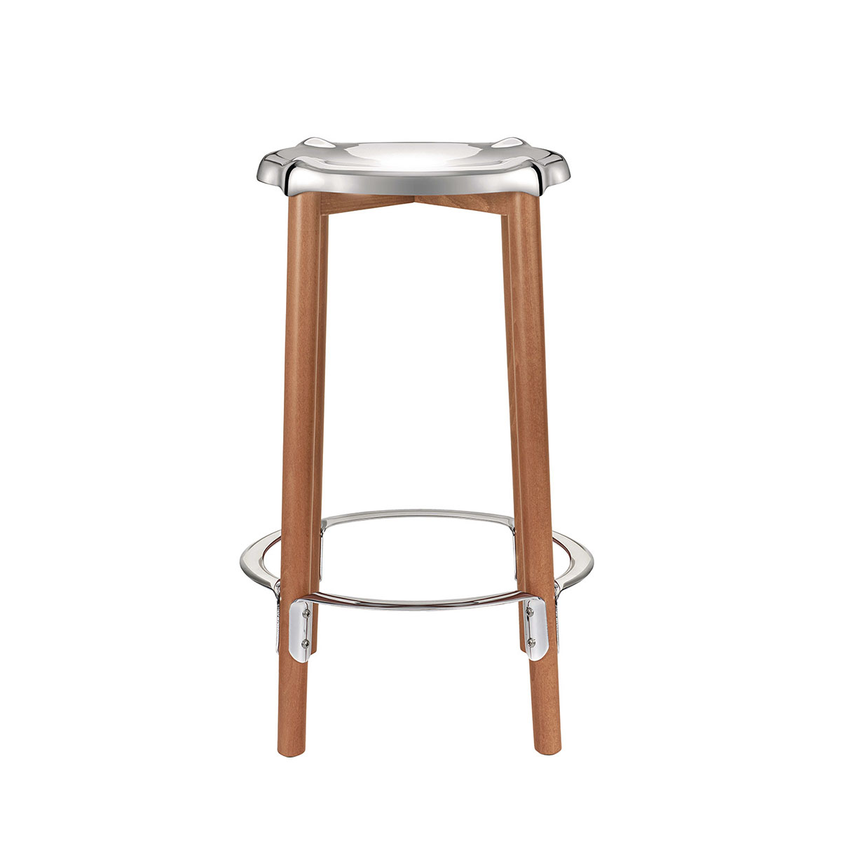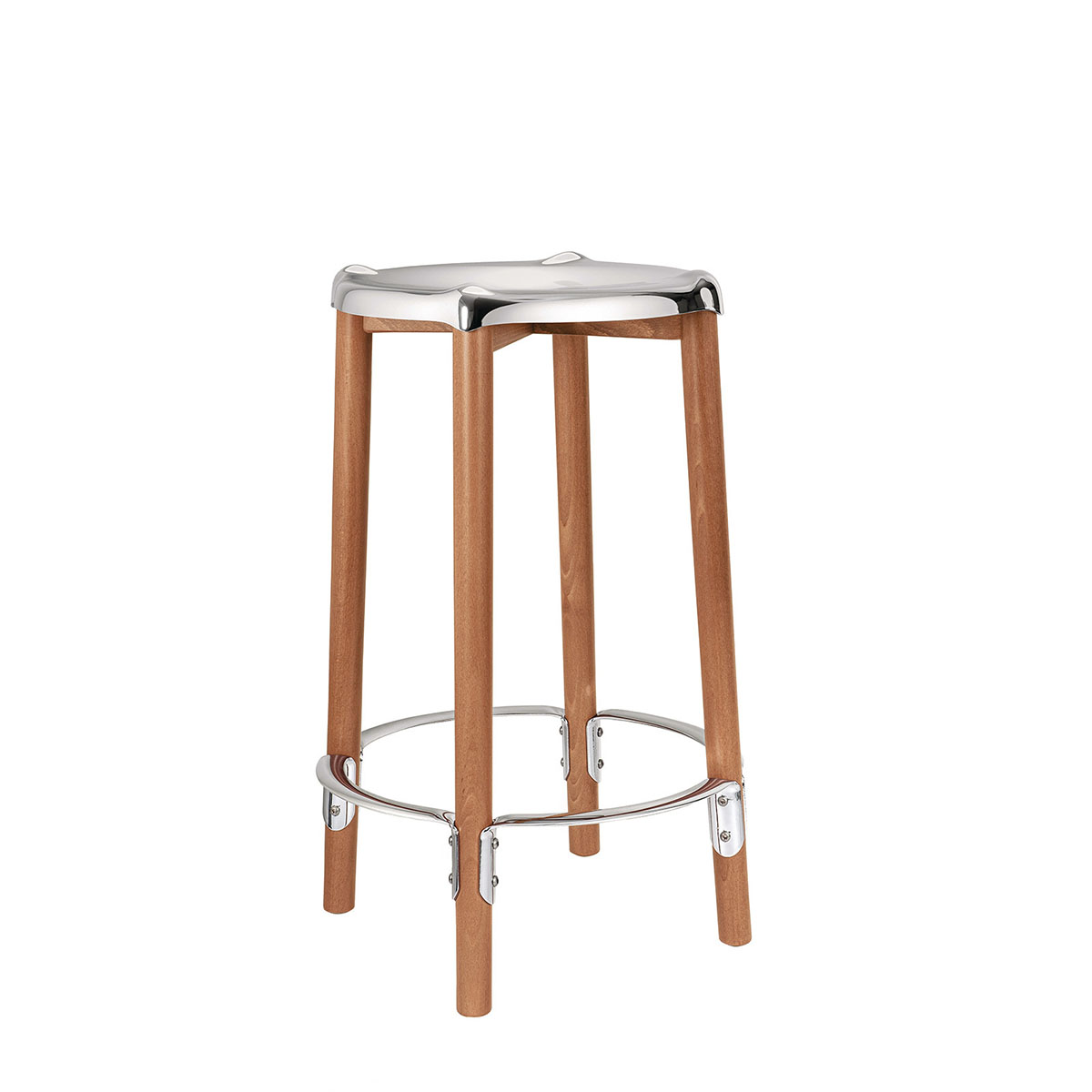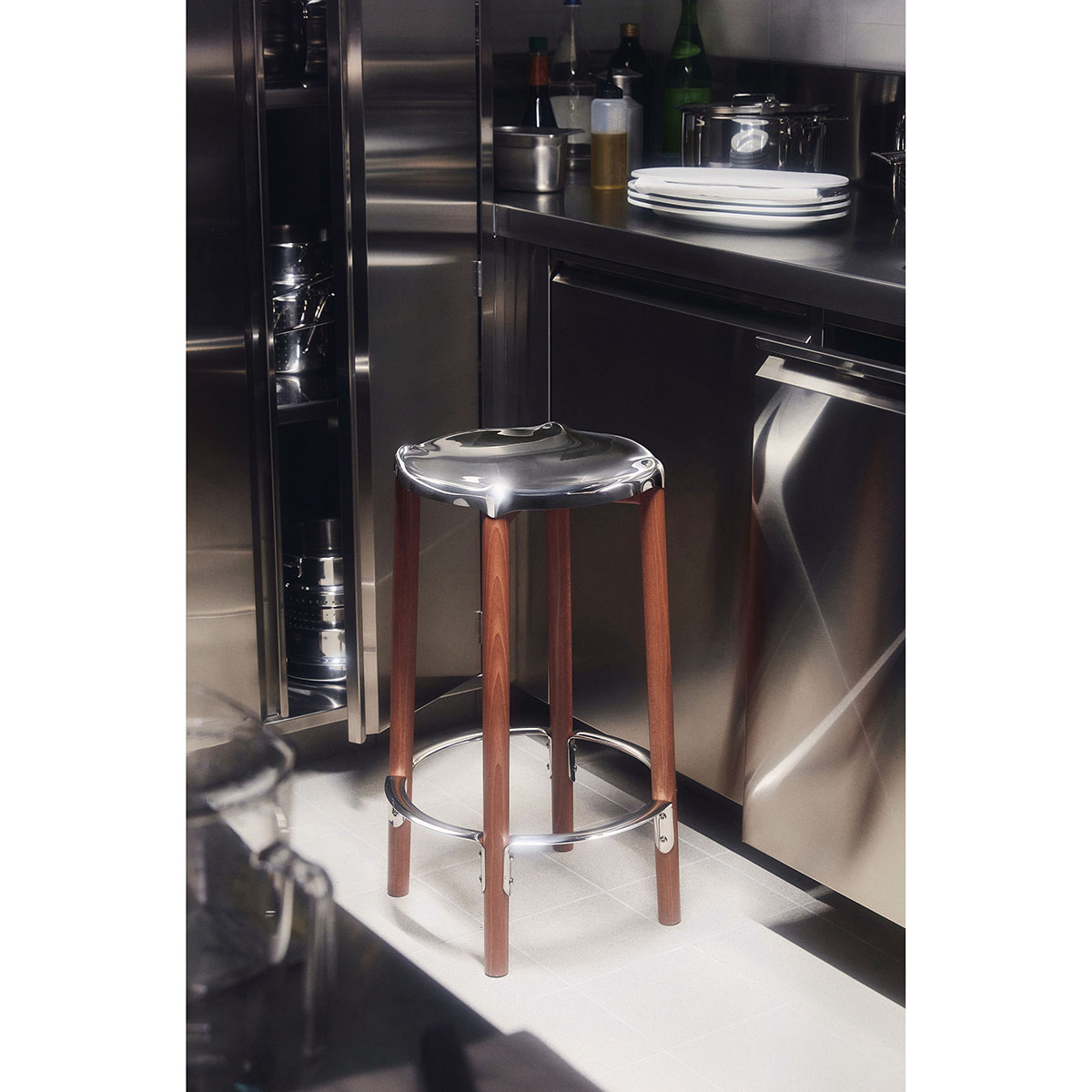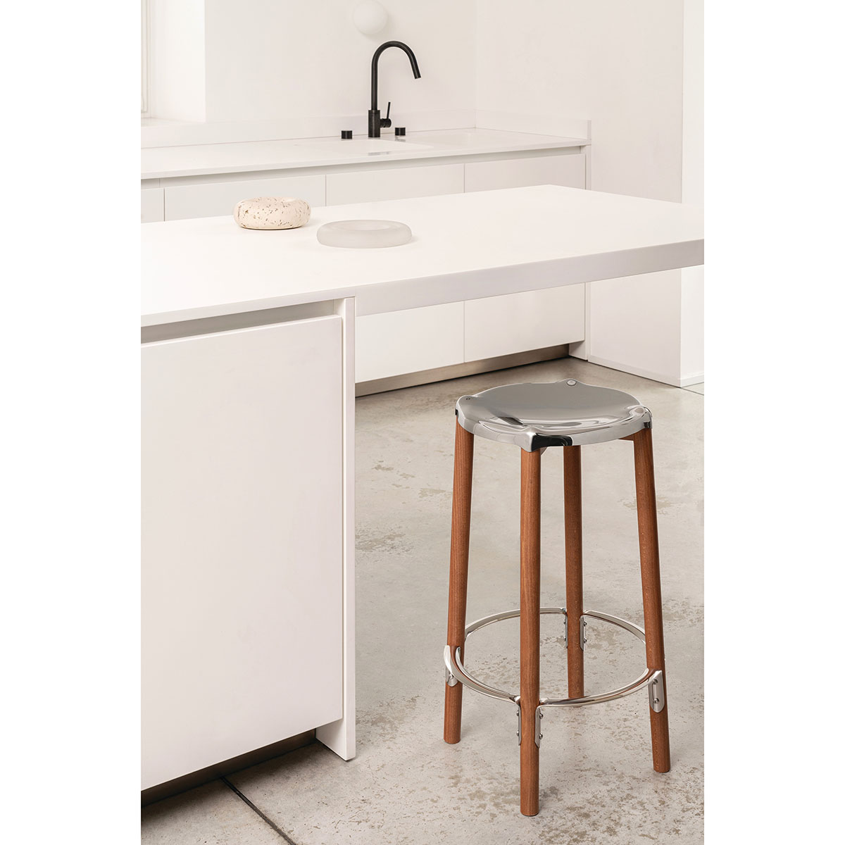 Dans cette nouvelle interprétation du tabouret par Philippe Starck la forme douce de l’assise dialogue par contraste avec le design essentiel du reposepied. Le bois de hêtre, traité avec une finition transparente, sublime la nature de cette essence en mettant en valeur l’association avec le métal. Vedette incontestée de l’ameublement de la cuisine ou du bar lounge, ce tabouret séduit par ses détails non conventionnels et son confort bien calibré.