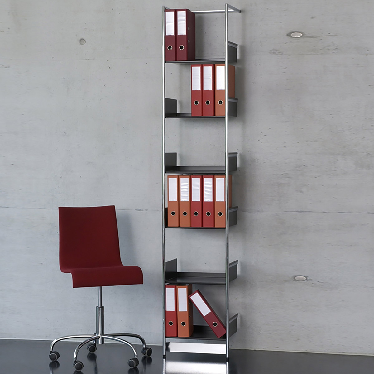 L‘étagère Pool étonne encore aujourd’hui par sa statique et sa légèreté et reste inégalée dans sa catégorie. Bien que seulement appuyée contre une paroi ou une fenêtre, elle sera de plus en plus stable, plus vous la chargerez. Avec des tablards de raccordement, vous pouvez combiner deux étagères.