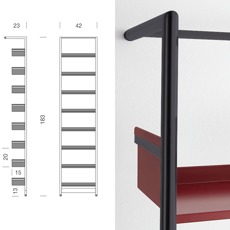 Une étagère élégante, qu’on appuye simplement au mur. Grâce à sa structure filigrane, cette étagère élégante n’occupe optiquement que peu de place. Elle convient donc aussi pour des endroits étroits. Lors d’un déménagement ce meuble est particulièrement pratique, il ne faut que déserrer quatre vis pour qu’il ne prenne presque plus de place. • Le meuble à CD est livré à l’état démonté, l’assemblage est très simple • Dimensions : largeur 42 cm, profondeur 23cm, hauteur 183cm