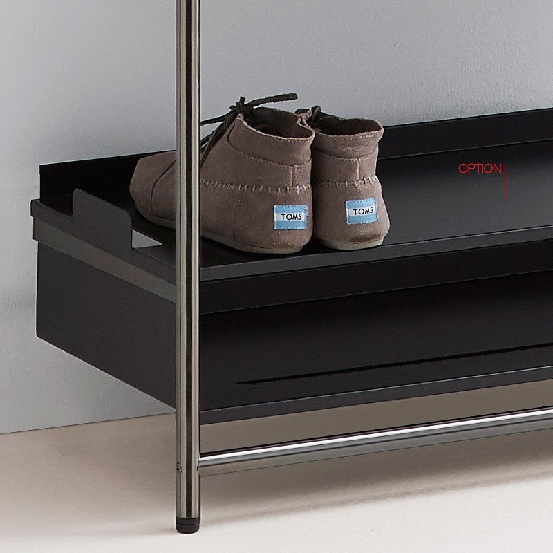 La tringle de 80cm de longueur offre beaucoup de place pour les vestes et les manteaux. Les deux rayons inférieurs peuvent accueillir chaussures, sacs, portables et toutes les petites choses que l’on utilise au quotidien.