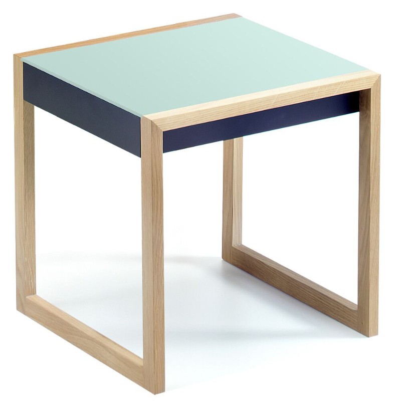 Petite table XL : largeur 60cm, profondeur 40cm, hauteur 62.5cm – verre laqué turquoise.
