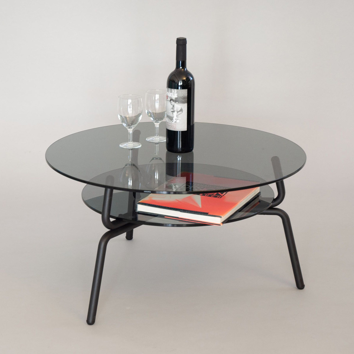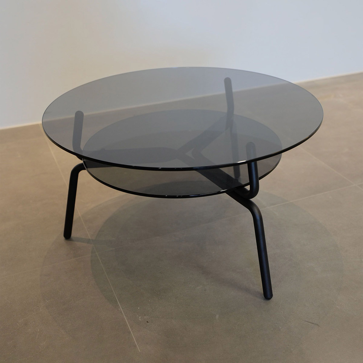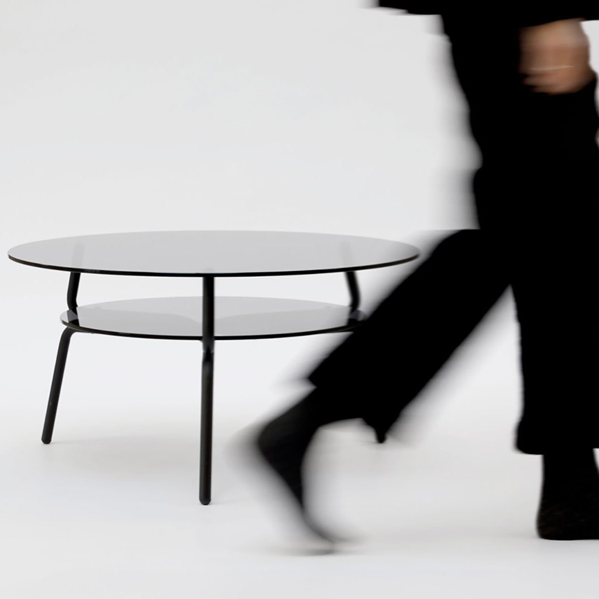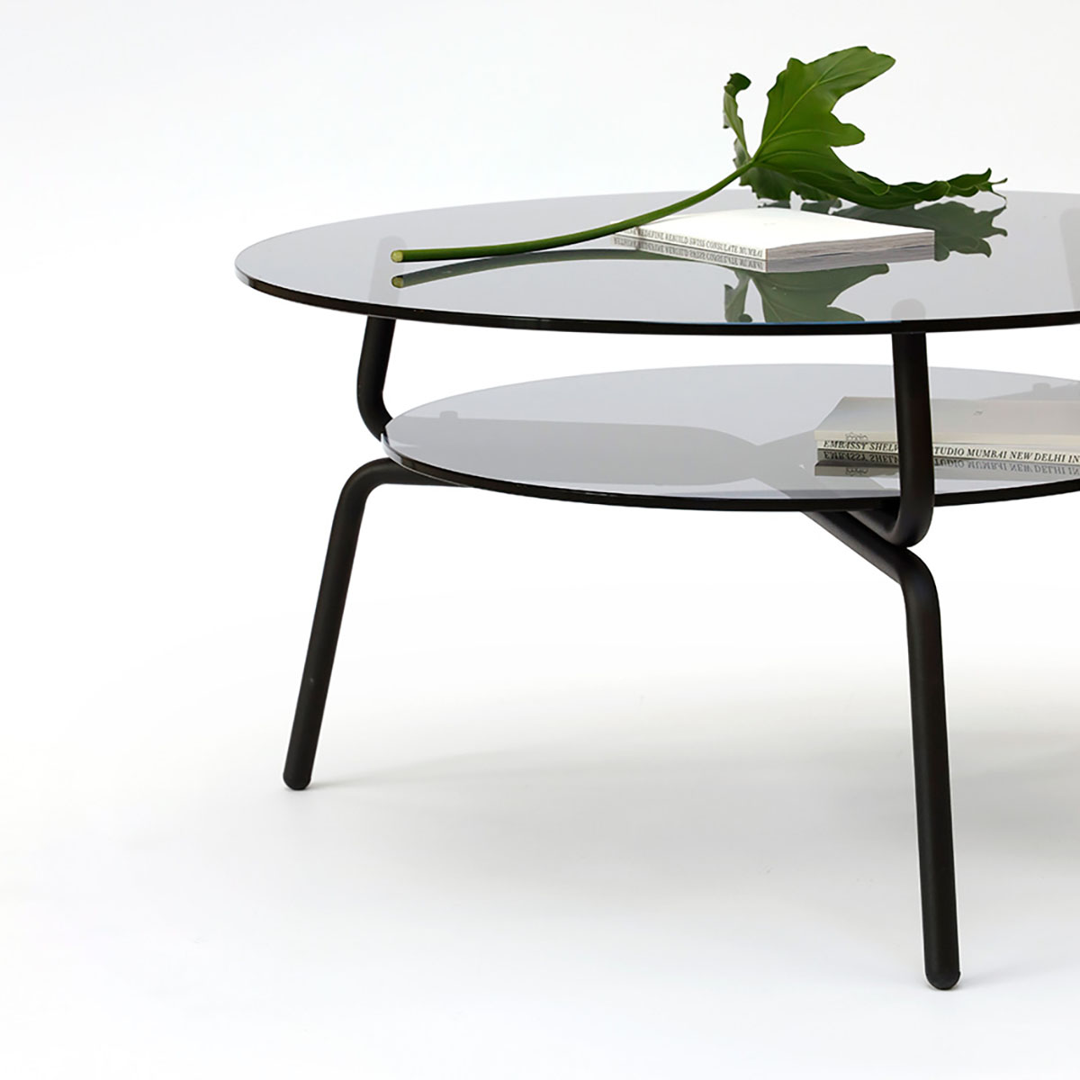 Deux plateaux en verre teinté sont superposés, laissant entrevoir le piètement finement travaillé. Trois tubes identiques, courbés et laqués en noir, sont vissés ensemble pour former une structure solide qui supporte élégamment les plateaux en verre. Le design incarne la modernité et une élégance discrète.