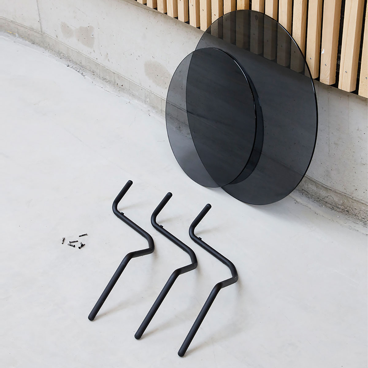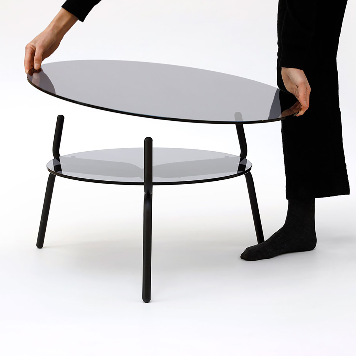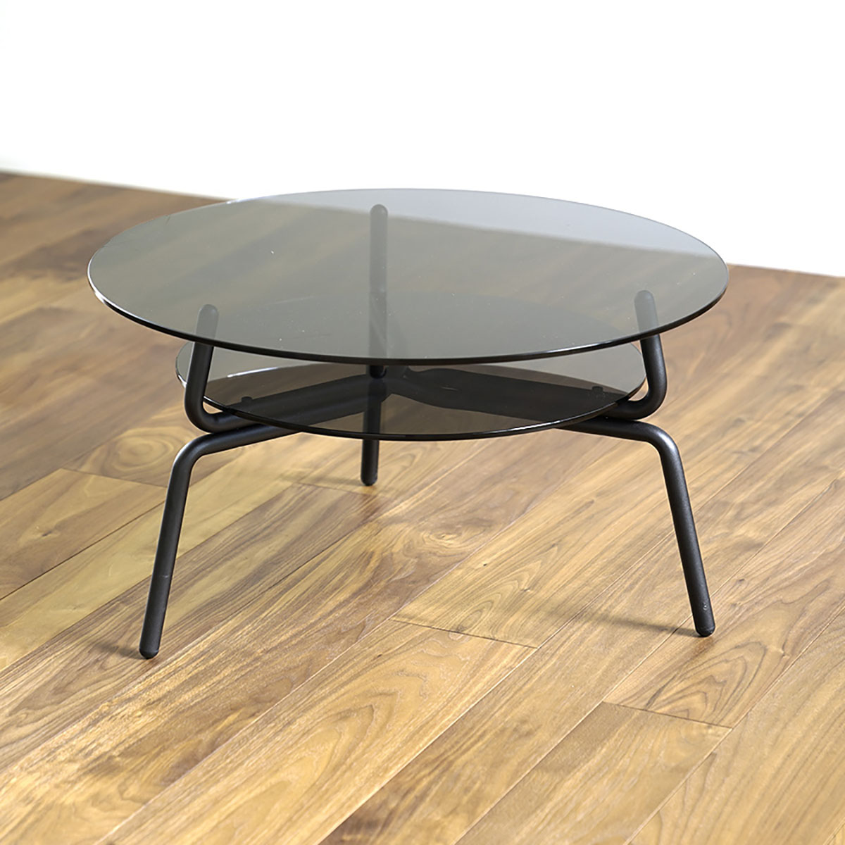 Deux plateaux en verre teinté sont superposés, laissant entrevoir le piètement finement travaillé. Trois tubes identiques, courbés et laqués en noir, sont vissés ensemble pour former une structure solide qui supporte élégamment les plateaux en verre. Le design incarne la modernité et une élégance discrète.