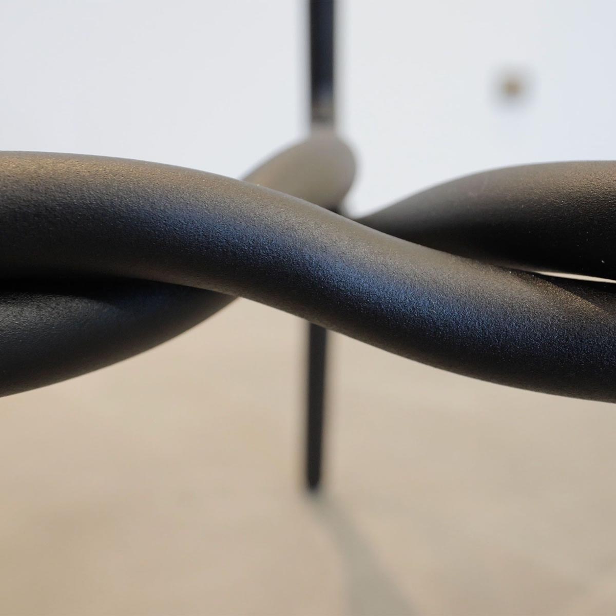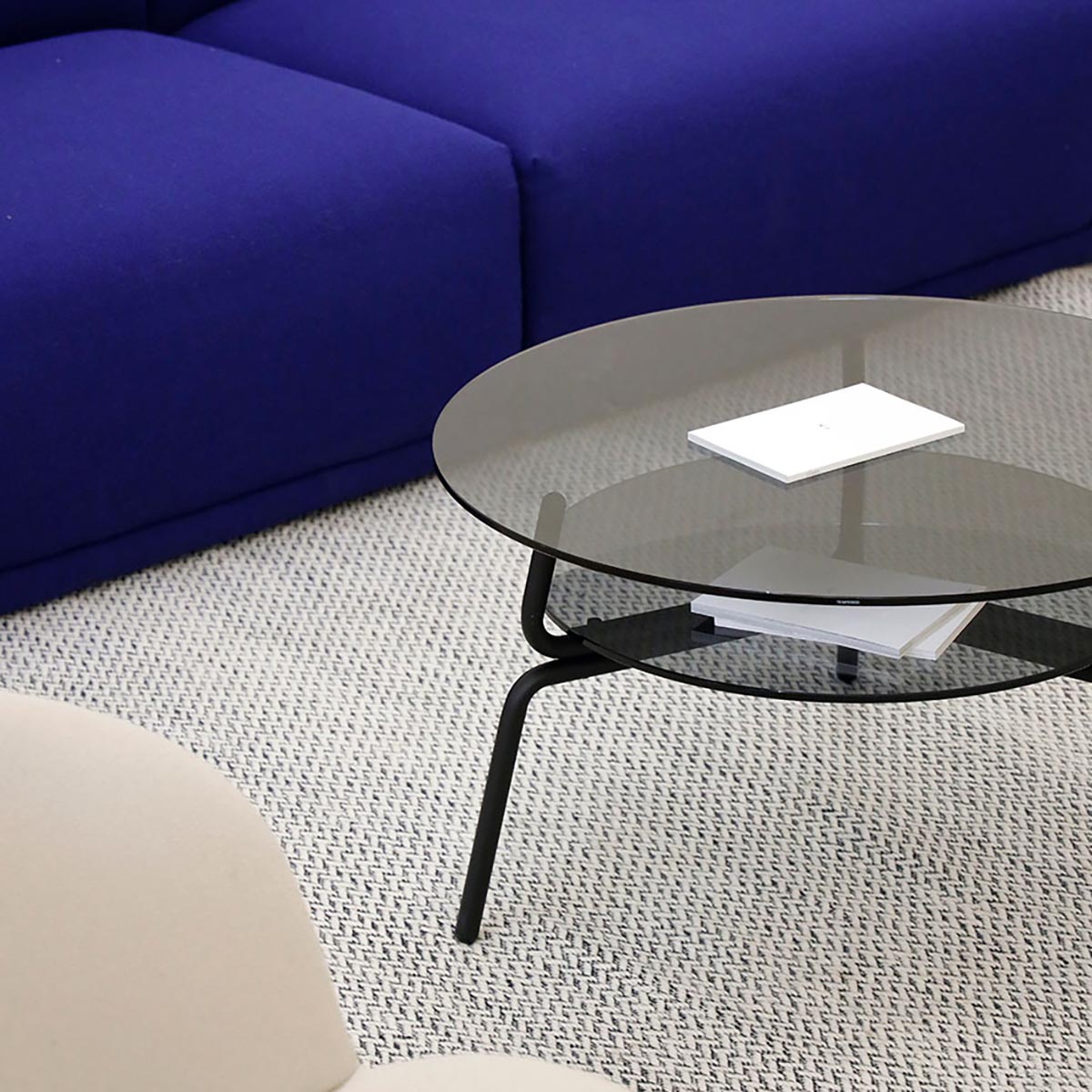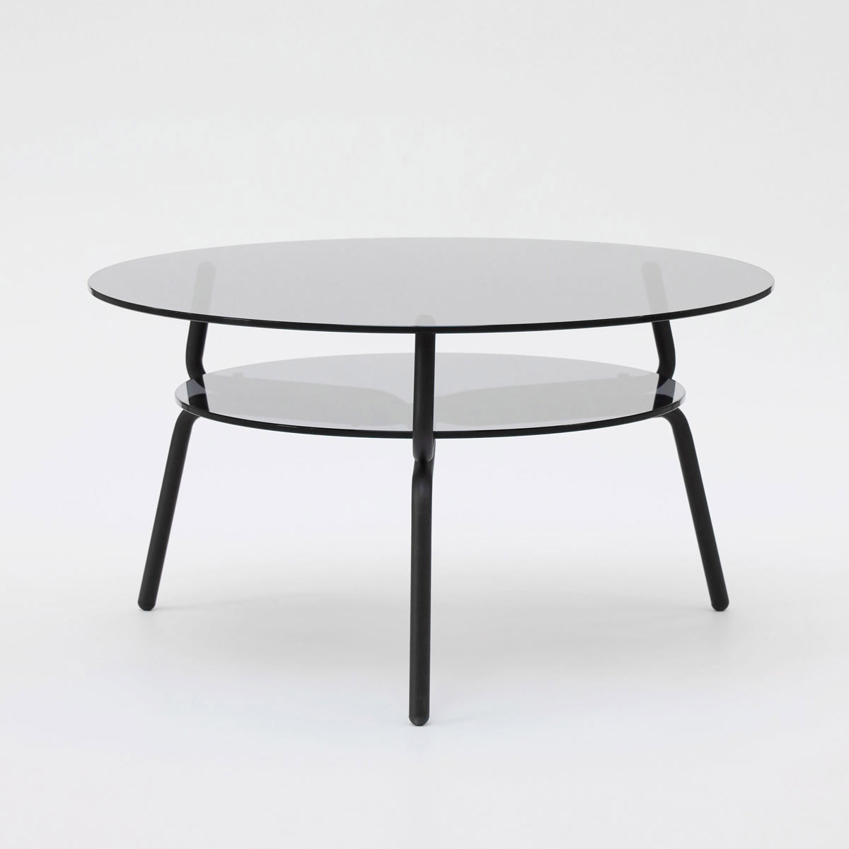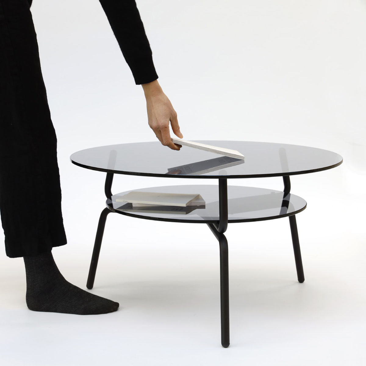 Deux plateaux en verre teinté sont superposés, laissant entrevoir le piètement finement travaillé. Trois tubes identiques, courbés et laqués en noir, sont vissés ensemble pour former une structure solide qui supporte élégamment les plateaux en verre. Le design incarne la modernité et une élégance discrète.